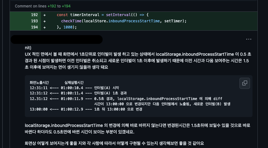 ์ฝ๋ ๋ฆฌ๋ทฐ๋ฅผ ์งํํ๋ ์ค, ๊ธฐ์กด ๊ตฌํ๋ ํ์ด๋จธ์์ ์ธํฐ๋ฒ ์์ ์ด ์ง์ฐ๋๋ ๋ฌธ์ ๊ฐ ์๋ค๋ ํผ๋๋ฐฑ์ ๋ฐ์์ต๋๋ค.