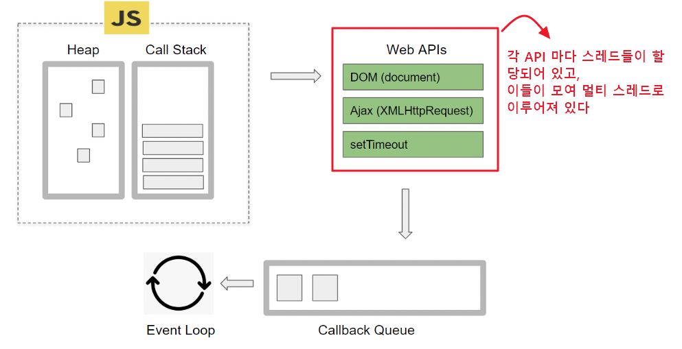 μλ°μ€ν¬λ¦½νΈλ₯Ό μ€ννλ μ½ μ€ν(Call Stack)μ μ±κΈ μ€λ λμ§λ§, μλ²μκ² λ¦¬μμ€λ₯Ό μμ²νκ±°λ νμΌ μ μΆλ ₯ νΉμ νμ΄λ¨Έ λκΈ° μμ μ μ€ννλ Web APIs λ€μ λ©ν° μ€λ λμ΄κΈ° λλ¬Έμ λμ μμ μ²λ¦¬κ° κ°λ₯νκΈ° λλ¬Έμ΄λ€.